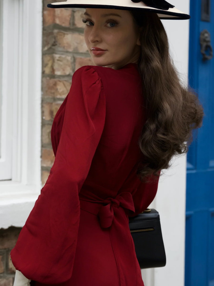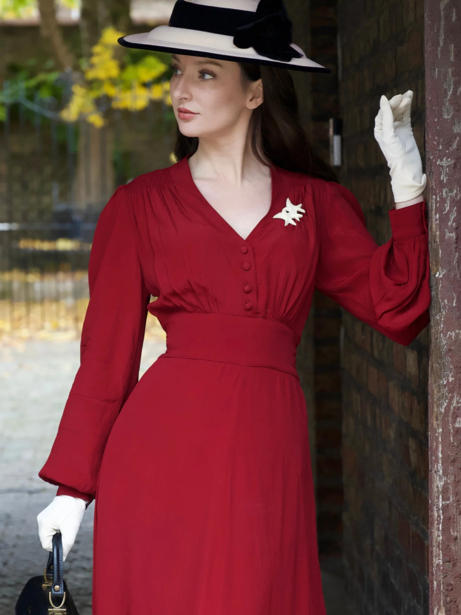Wenn Sie die zeitlose Eleganz alter Hollywood-Filme lieben, ist dieses 30er Jahre Kleid in dunklem Weinrot wie gemacht für Sie. "Ava Dress Windsor Wine" von The Seamstress of Bloomsbury ist ein Damenkleid im 30er Jahre Vintage-Stil, das nach einem Originalschnitt gearbeitet ist. Verlieben Sie sich in die zeittypischen Details wie die schmale und doch fließende Silhouette, die eleganten Raffungen am Oberteil und die bauschigen Ärmel. Originalgetreu aus fließender, hochwertiger Viskose gefertigt, legt sich das Kleid sanft um Ihre Silhouette und betont dennoch Ihre femininen Kurven.