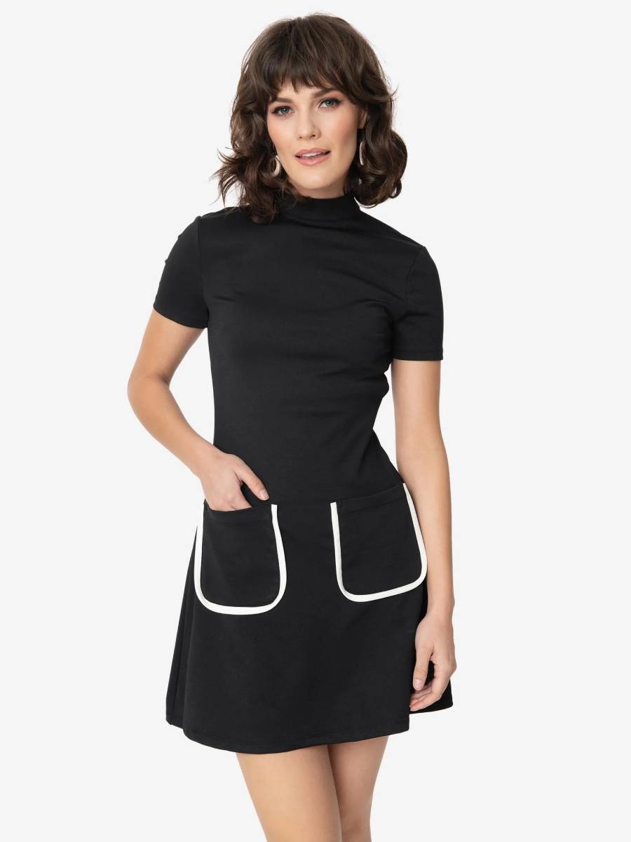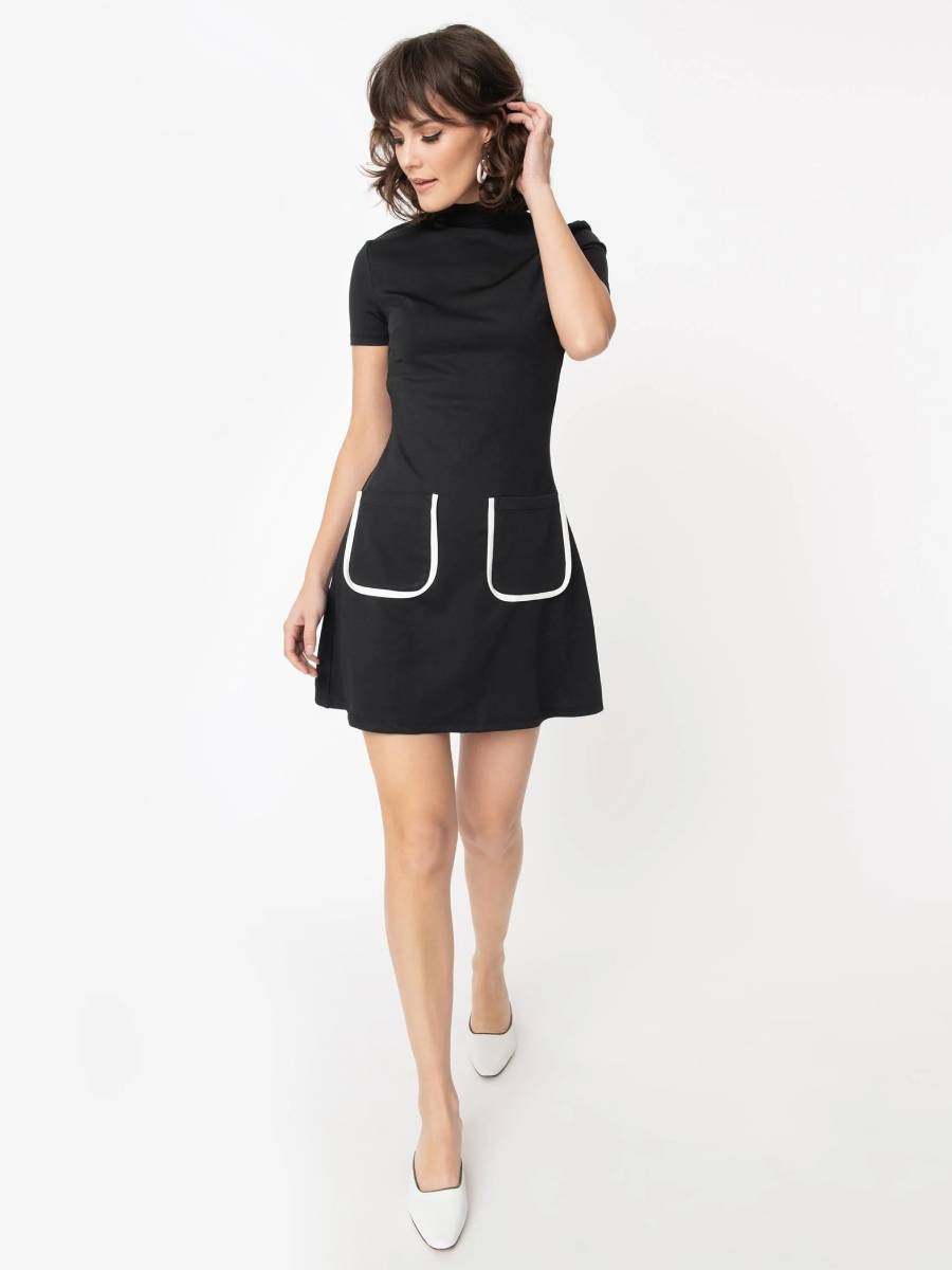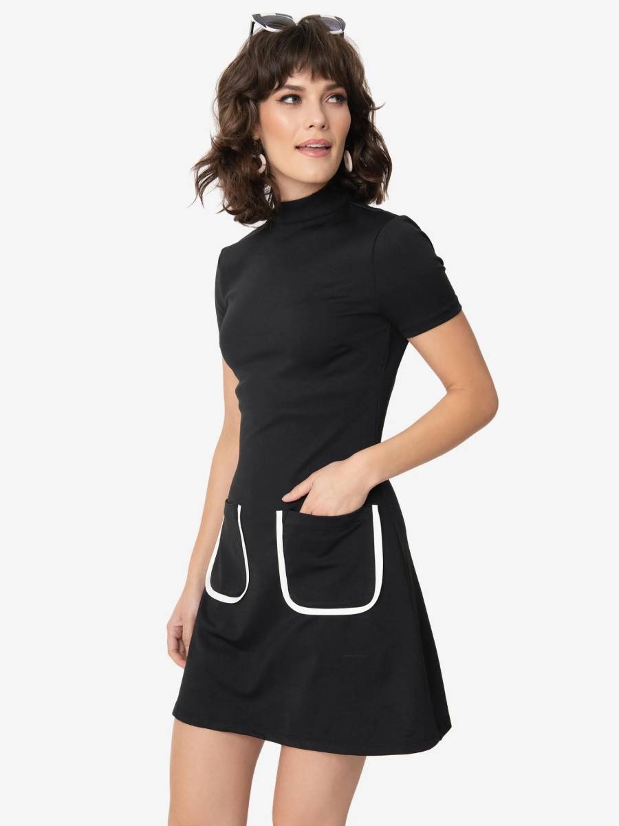 Sixties-Look in Schwarz und Weiß: Schwarzes Mod Hängerkleid "Black Mock Turtleneck Wave Maker Mini Dress" von Smak Parlour/Unique Vintage in typischer A-Linie mit kurzen Ärmeln. Der Clou sind die beiden aufgesetzten Taschen mit weißen Zierpaspeln vorn. Leicht taillierter Schnitt. Runder hochgeschlossener Halsausschnitt mit Stehkragen, zwei schräge Abnäher über der Brust. Keyhole-Effekt mit Knopf und Reißverschluss im Rücken.