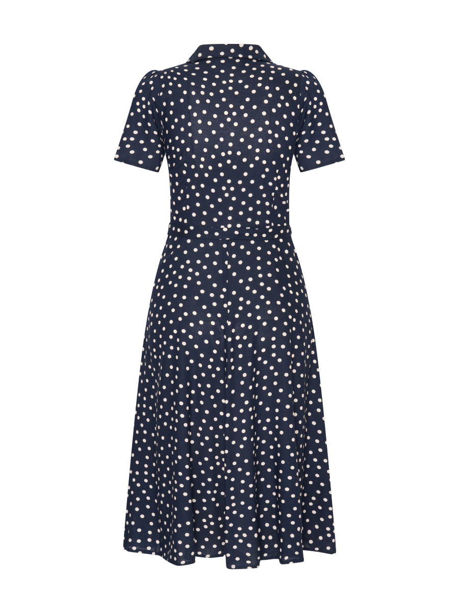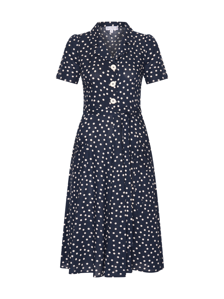 Fabelhafter Forties-Style: Dunkelblaues Hemdblusenkleid im 40er Jahre Vintage Stil "Revers Dress Navy Dots Viscose" von Very Cherry aus duftiger Viskose mit fröhlichen weißen Tupfen. Das Kleid hat einen klassischen Kragen mit V-Ausschnitt und wird am Oberteil vorne durchgeknöpft, der Rock ist in A-Linie leicht ausgestellt mit zwei praktischen aufgesetzten Taschen vorn. Kurze Ärmel, seitlicher Reißverschluss, ein passender Bindegürtel aus Stoff betont die Taille. Durch das angenehme, weich fließende Material ist dieses Kleid perfekt für den Alltag, macht aber auch bei festlichen Anlässen eine gute Figur.