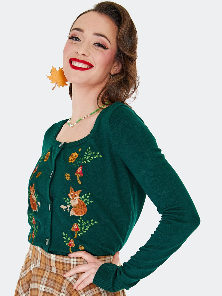 Dunkelgrüner Damen-Cardigan im Vintage Stil mit eckigem Ausschnitt und langen Ärmeln, mit Blumen, Pilzen und Füchsen bestickt